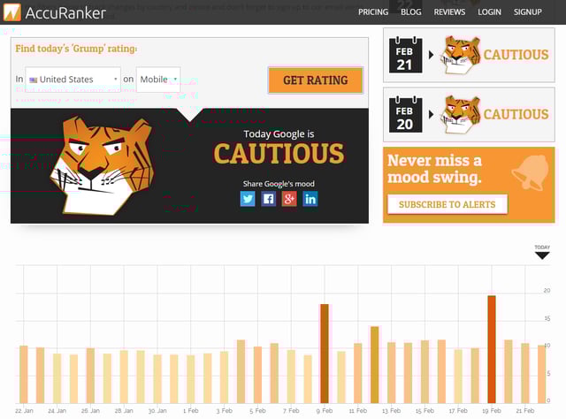 When the ranking changes increase the index jumps up and changes the mood. In the screenshot above Google’s mood is cautious, which indicates there is some activity, but nothing indicating a possible Google update.