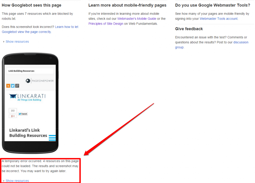 As you can see, the tool informs us that there was a temporary error, and four resources on the page could not be loaded (this goes back to why this tool should not be your basis for mobile testing).