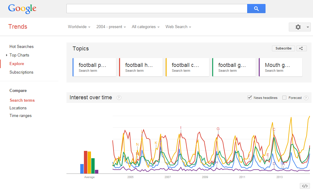 Looking at our Trends chart, we can see that interest in our football related terms is very seasonal with peaks and lulls. This makes sense as football is a seasonal sport.