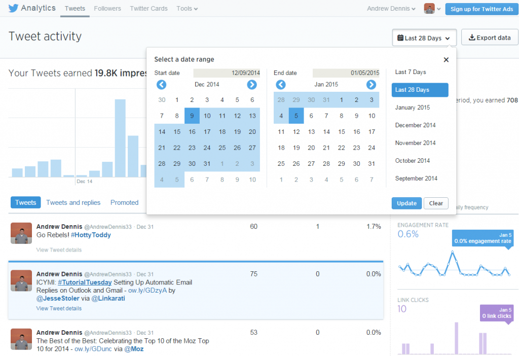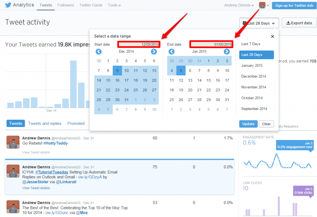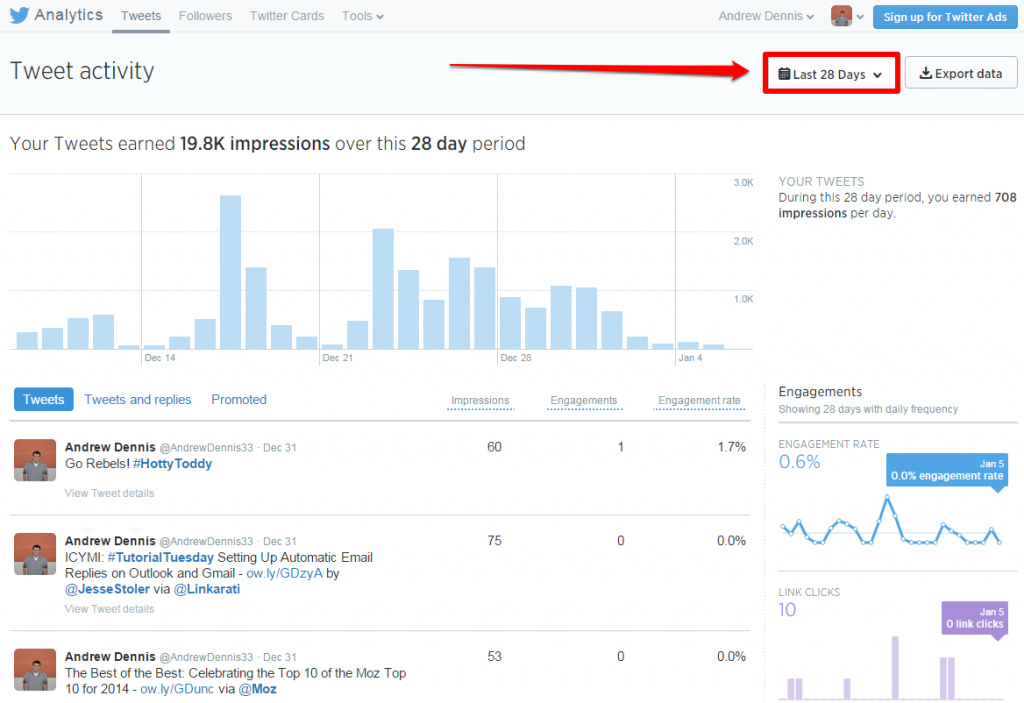 Twitter Analytics is set to automatically show your tweet activity over the last 28 days. To review your activity from the past year, you have a number of options. Start by clicking on the drop down tab underneath your name.